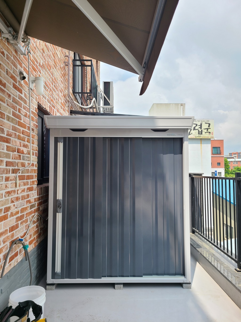 이나바창고 아진하모니는 창고 설치 시 바닥에 벽돌을 두고 작업이 이루어지는데,